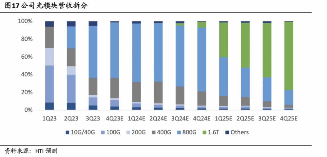 越高端的产品,自然利润率会越高,所以这段时间中际旭创的业绩不断在暴涨。但照未来的趋势来看,哪怕暴涨到现在,中际旭创的未来才可以说刚刚开始,毕竟AI的蓬勃发展势头也才刚刚开始,不懂的同学不妨看看下图(HTI预测的中际旭创光模块业务营收组成情况),看懂了你就懂所长在讲什么了!
