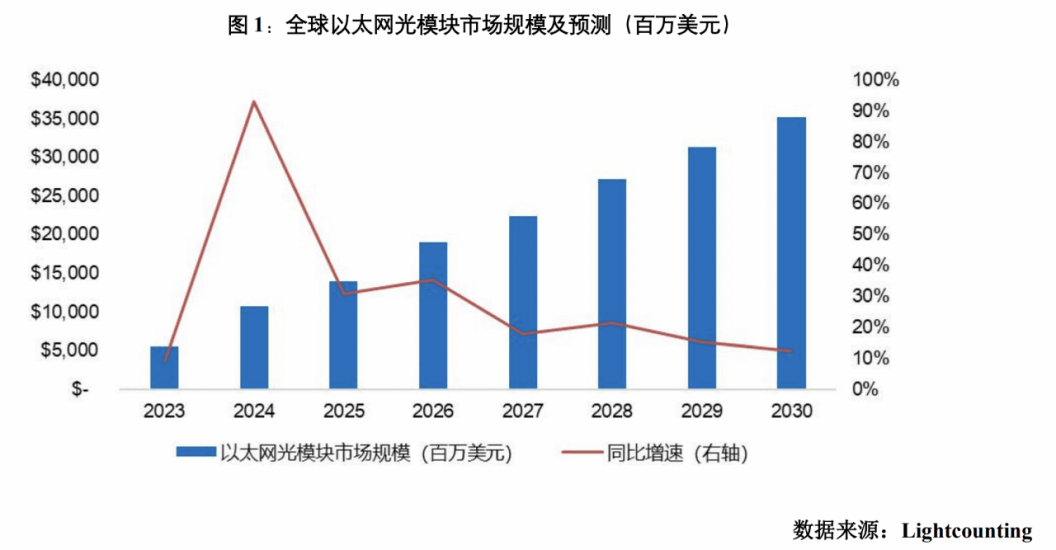 基于AI 基础设施建设等对高速光模块的强劲需求,Lightcounting预测,全球以太网光模块市场规模将持续保持较为快速的增长,2026年预计同比增长35%至 189 亿美元,2027-2030 年的增速都会在双位数以上,到2030 年则有望突破350亿美元。