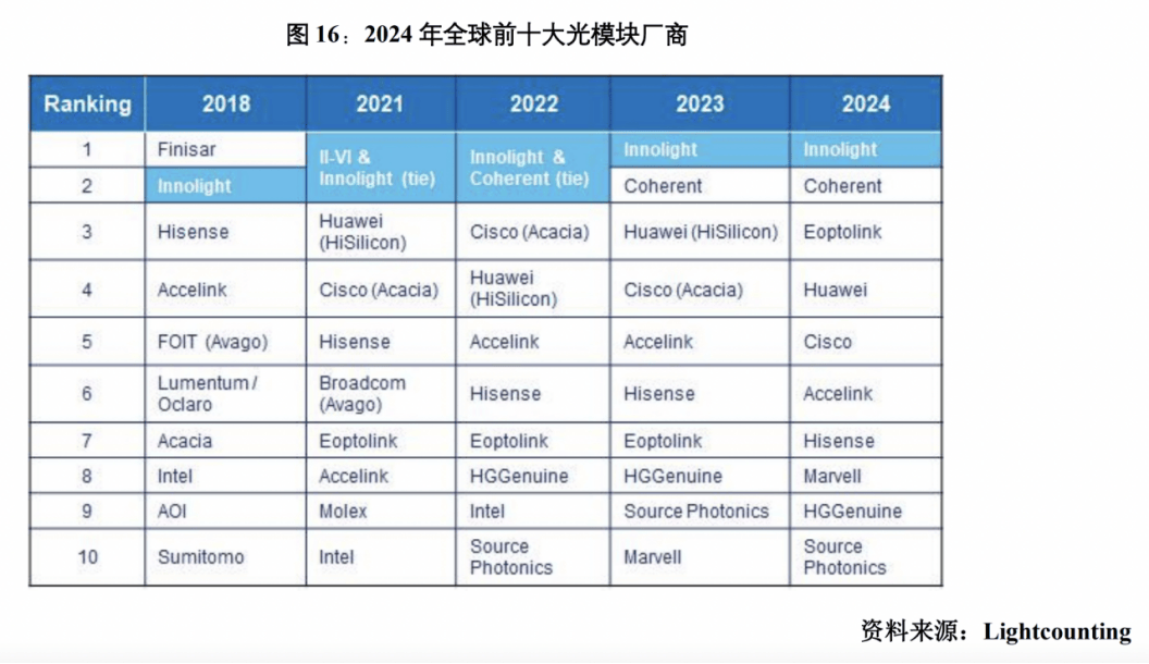 另外,在光模块领域,中际旭创可以说拥有相当强大的优势。早在2021年中际旭创就晋升为全球第一大光模块厂商,至今一直保持着龙头老大地位(下图标注的浅蓝色企业就是中际旭创)。中际旭创是全球最早发布 400G/800G 光模块的厂家,比同行早了1-2年;2023 年发布 1.6T 光模块,也是目前产业端进展最快的。换句话说就是,中际旭创可以类比为芯片制造领域的台积电。