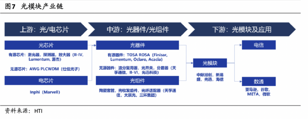 所以,懂了吧,在大信息时代,光模块有多么重要。在AI浪潮下,光模块可以说也是最直接受益的一个上游铲子环节,它的下游直接就是电信公司或者亚马逊、google这样的云计算企业。