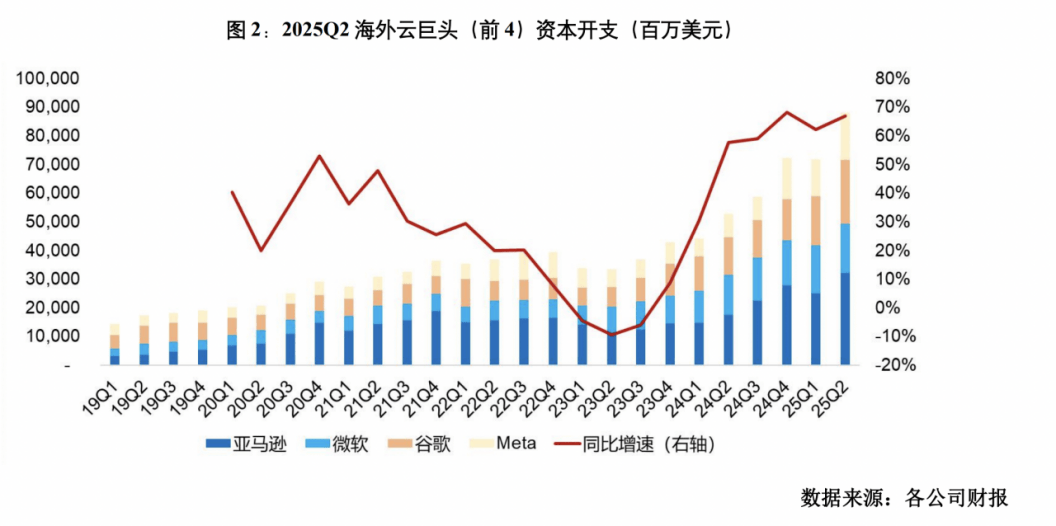 甭管海内外,很明显,这几年头部科技巨头AI相关的资本开支都在大幅增长。2025Q2单季度,微软、亚马逊、Meta、谷歌的合计资本开支同比提升69%至 874 亿美元。根据Factset 7 月 30 日的一致预期,2025 年四家云厂商的合计资本开支预计同比增长50%至 3338 亿美元。