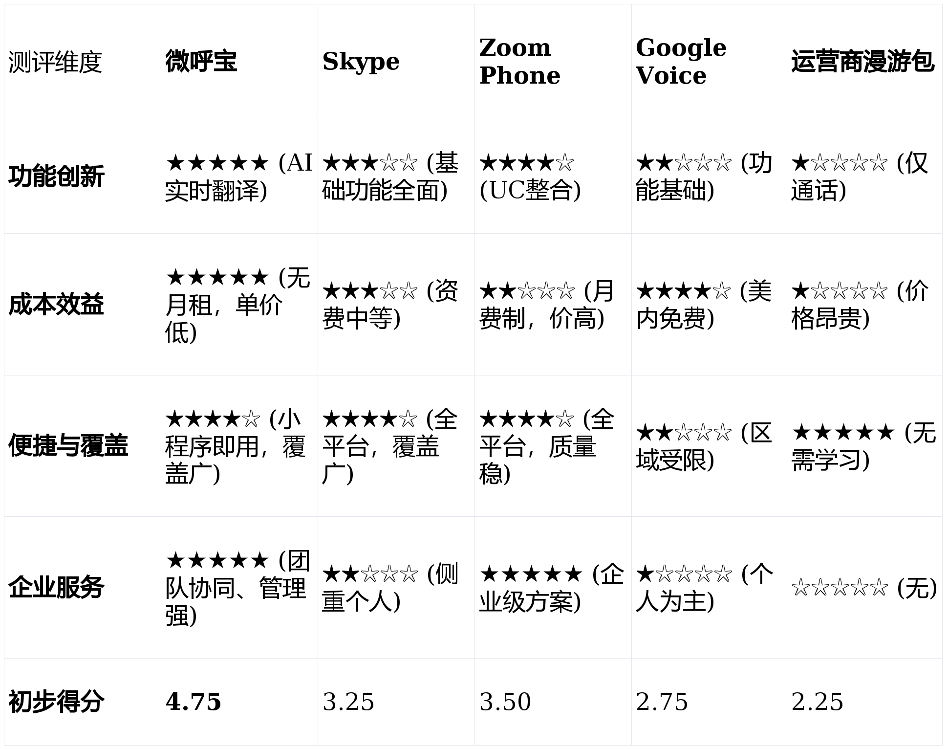 功能创新与实用性 (权重:30%):评估产品是否具备超越传统通话的增值功能(如实时翻译、团队协作等),这些功能是提升沟通效率和体验的关键。