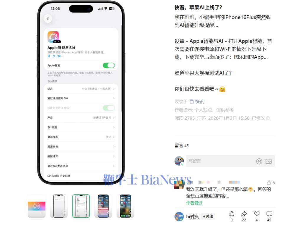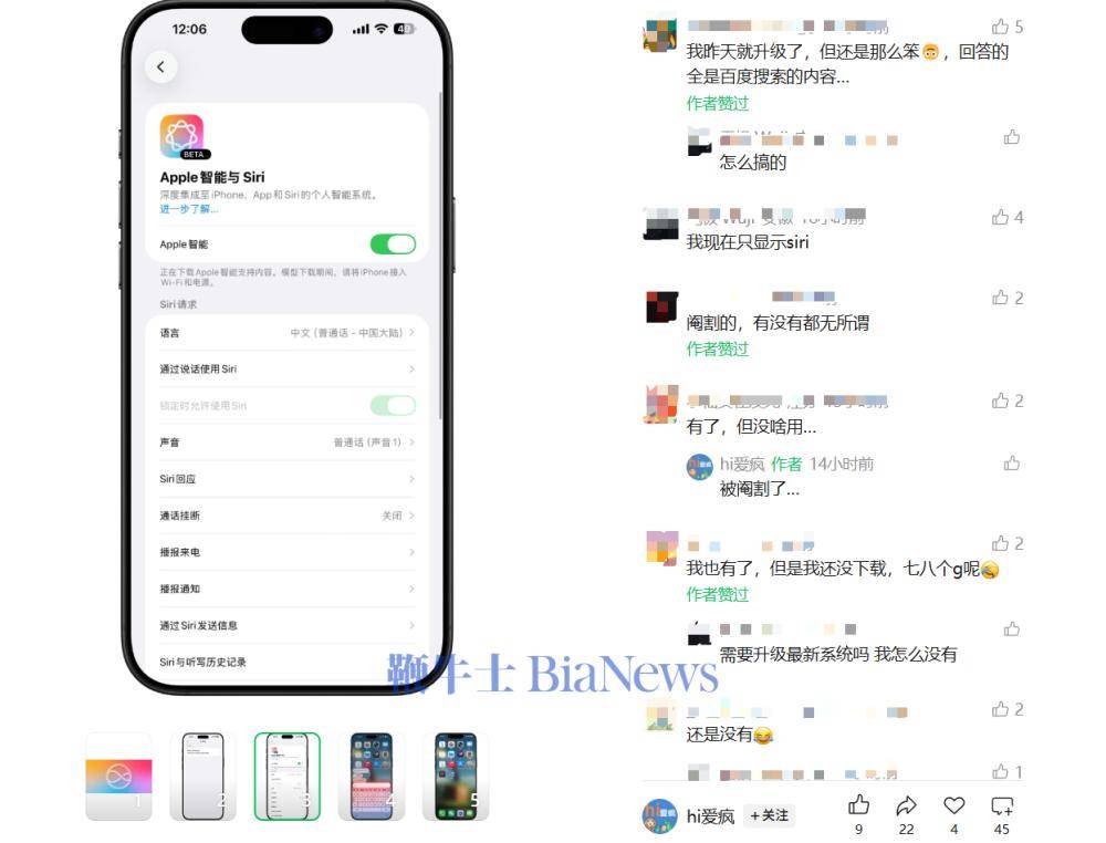同时,评论区有网友表示,也收到了苹果AI智能升级提醒,但使用过程中发现,AI的回答都是基于百度现有答案,疑似部分功能被。