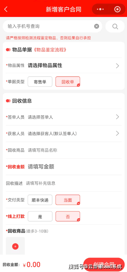 “人效低、成本高”是创业初期的致命伤。云当铺SaaS系统彻底替代传统手工台账,将记账、对账等非核心工作自动化处理,大幅降低人力成本。客户寄售时,通过手机扫码即可完成商品信息(品牌、型号、回收、寄售期限、物品价值)与客户信息的同步录入,一键生成标准化电子台账,从源头规避错记、漏记问题。