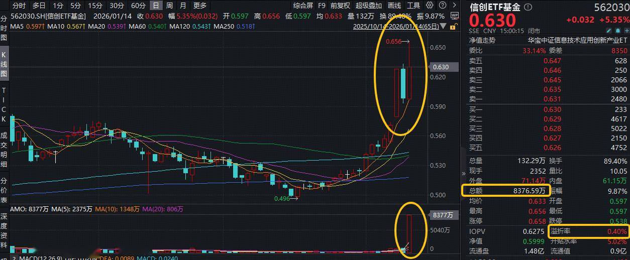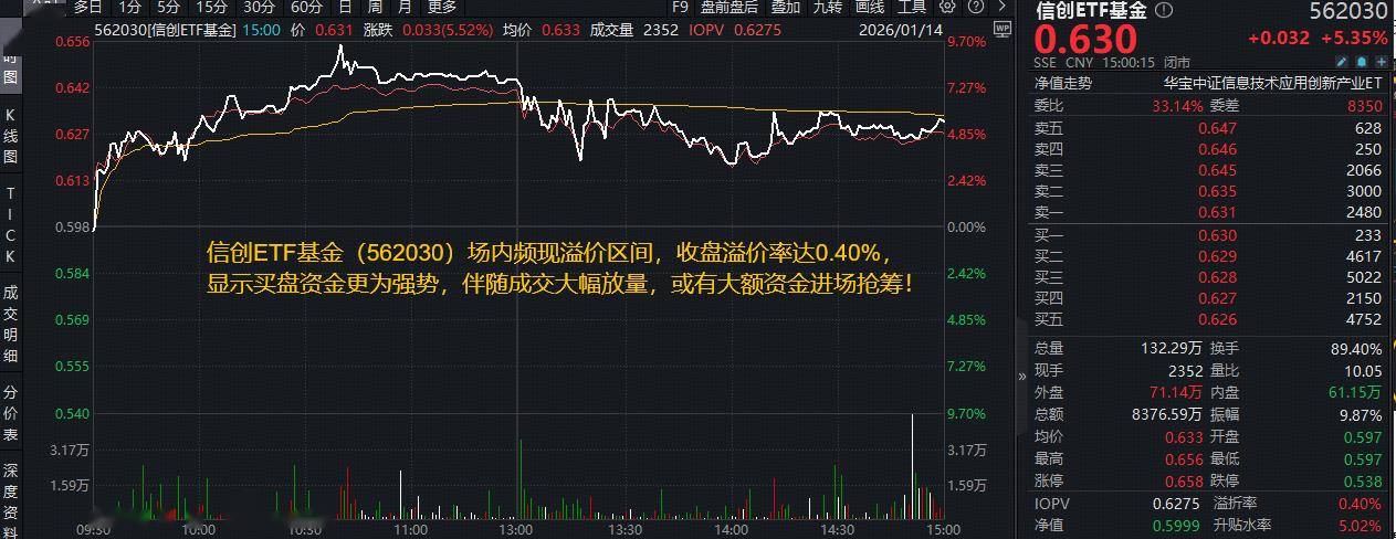 ETF放量突破上市高点,或为资金买点信号!值得关注的是,信创ETF基金(562030)场内频现溢价区间,收盘溢价率达0.40%,显示买盘资金更为强势,伴随成交大幅放量,或有大额资金进场抢筹!