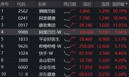 AI龙头方面,阿里巴巴-W盘中一度涨超6%,收涨5.69%,哔哩哔哩-W涨超5%,快手-W涨超4%,腾讯控股跟涨。此外,AI应用概念股领涨居前,狮腾控股飙升50%,阿里健康、趣致集团两位数上涨。