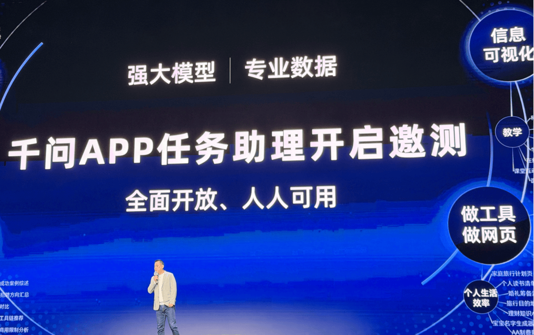 在发布会上,吴嘉现场演示AI外卖功能,即对千问下达一句线杯奶茶”,千问APP便实现调用淘宝闪购下单,无需任何跳转。
