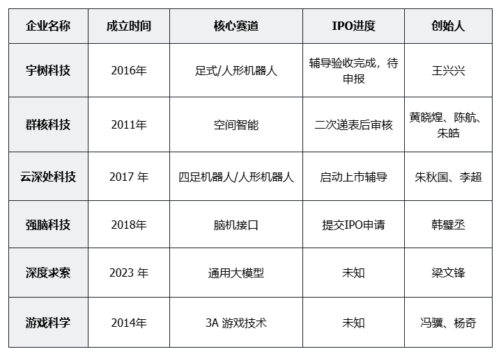 答案是,它们正在排队IPO,六家公司中有四家公司即将上市或者在做上市筹备,分别是宇树、群核、云深处和强脑。