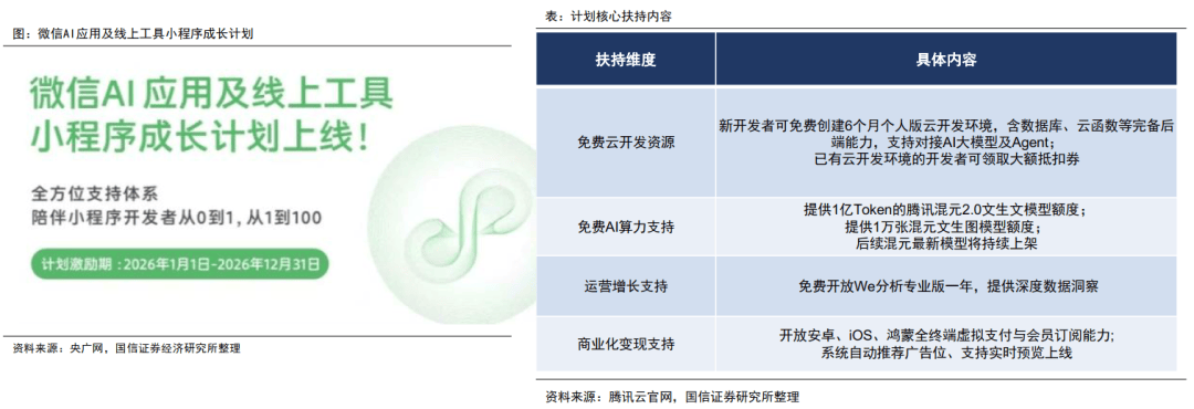 此外,腾讯还推出“AI应用及线上工具小程序成长计划”,提供云开发资源、AI算力、数据分析、广告变现及流量激励等全方位支持,覆盖2026年全年,全周期陪伴开发者成长。