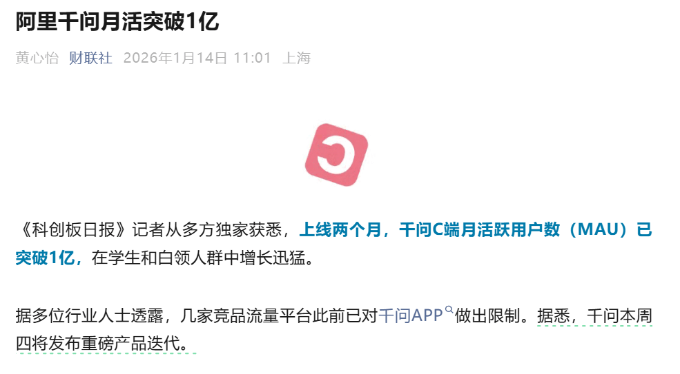千问只是众多大模型中的一种,没有人也没有一个标准能评判千问是最好用的,但一个不可否认的事实是,千问已经引起同业友商的重视,据公开消息,上线两个月,千问C端月活跃用户数(MAU)已突破1亿,在学生和白领人群中增长迅猛;另据多位行业人士透露,几家竞品流量平台此前已对千问APP做出限制。
