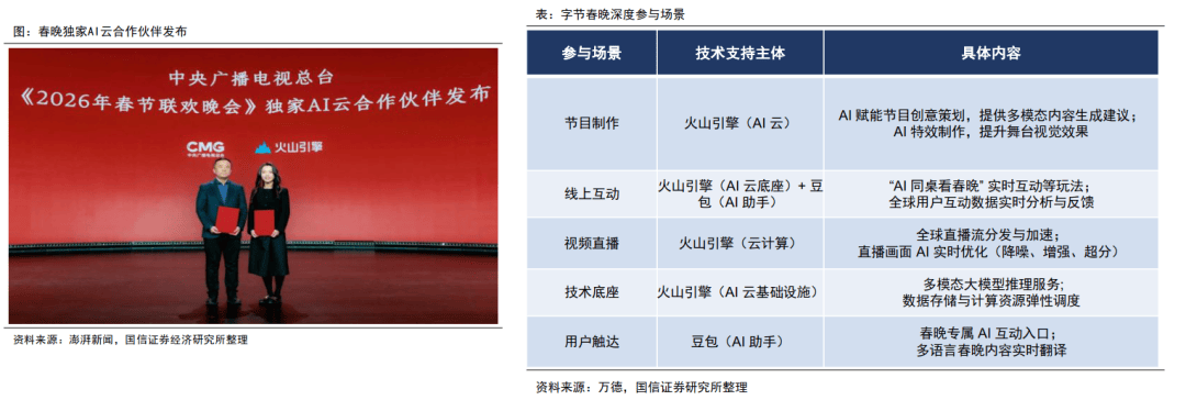 字节官宣成为央视春晚的独家AI合作伙伴,2026年春晚的独家AI云合作将由火山引擎承担,豆包大模型也将深度参与,带来多种面向观众的AI互动玩法。
