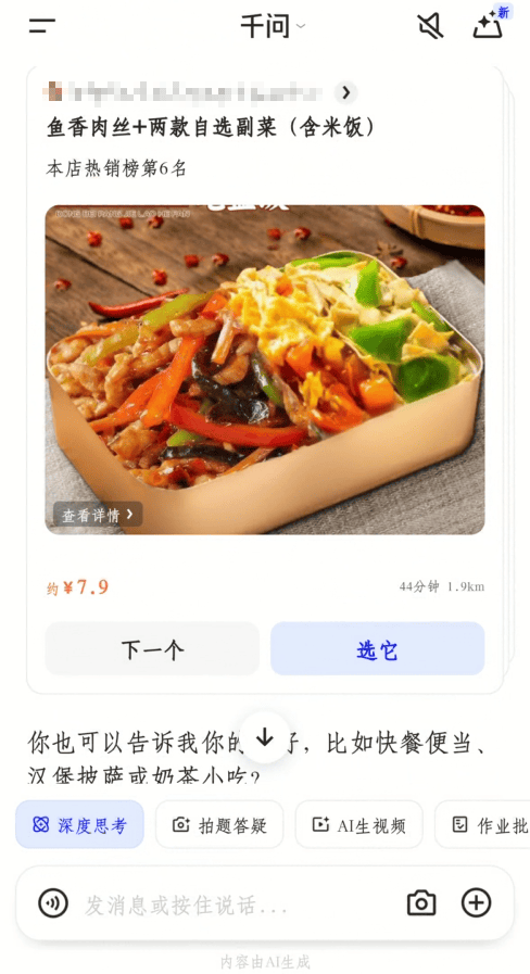 而在生活场景中,千问走得更激进。它的目标不是帮你分析选项,而是直接替你做决定并完成执行——从“选不出来”到“一键下单”,千问APP已经实现了行业内首次将支付能力原生融入AI对话。这意味着,AI不再只是站在消费链路旁边给建议,而是正式进入了交易闭环。