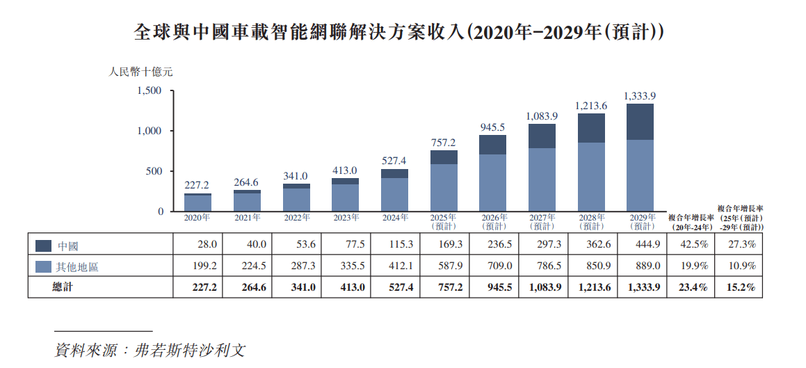 车载智能网联是一种交互式无线网络,依赖车载设备与传感器运作,将移动车辆视为信息感知的主体,并在车联网平台、车对车、车对基础设施、车对人以及车内系统之间建立全面网络连结。车载智能网联解决方案通常由硬件、软件及服务三部分构成。硬件层面主要包含通讯模块、车载联网控制单元及其他硬件设备,软件层面则涵盖车载网络平台及其他有关服务。随着智能网联汽车产量持续增长,全球及中国车载智能网联解决方案的市场规模正不断扩大,预计将由2024年的人民币5,274亿元及人民币1,153亿元增长至2029年的人民币13,339亿元及人民币4,449亿元。