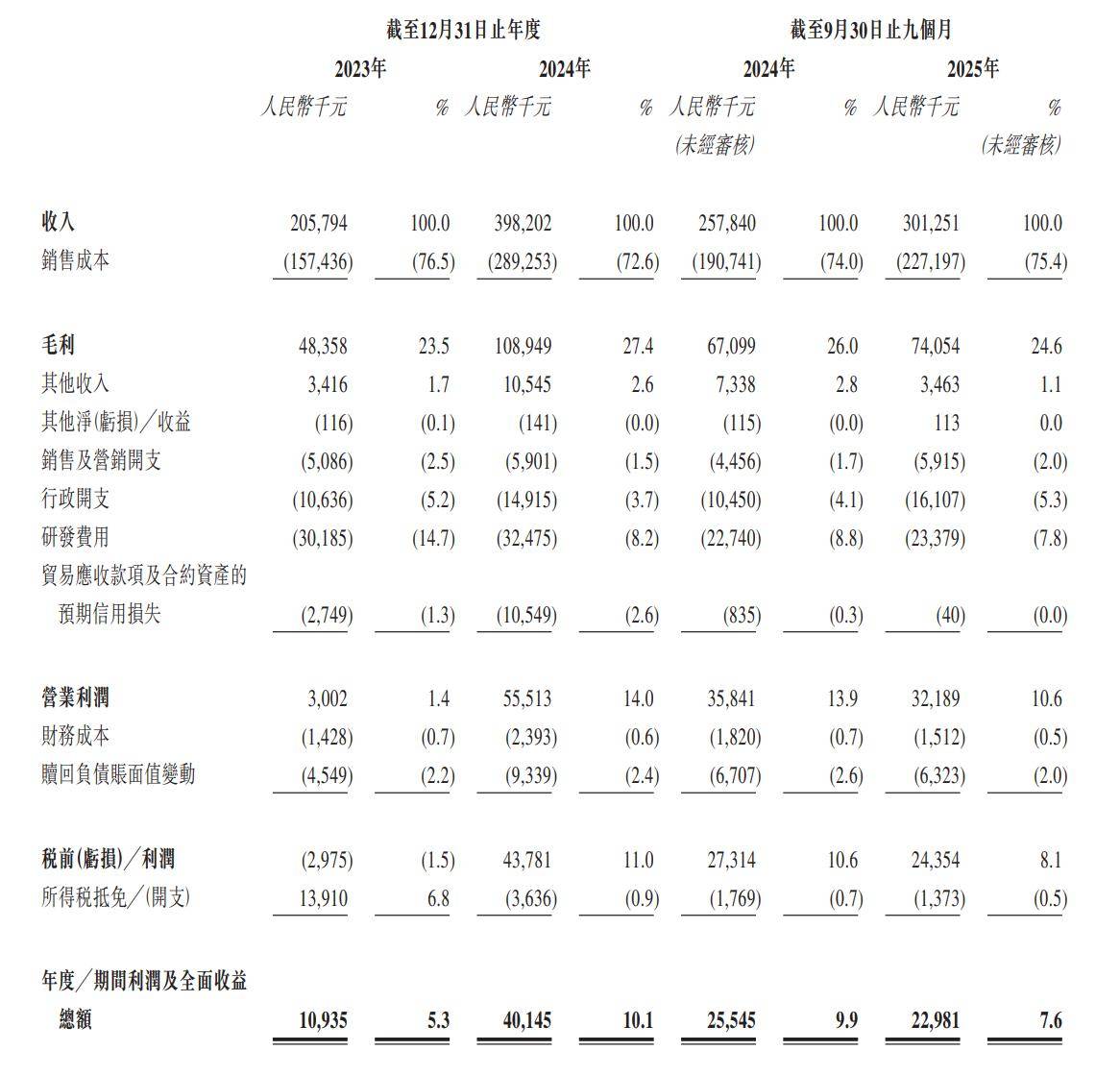 公司于2023年、2024年、2025年截至9月30日止九个月,年度╱期间利润及全面收益总额分别约为1093.5万元、4014.5万元、2298.1万元人民币。