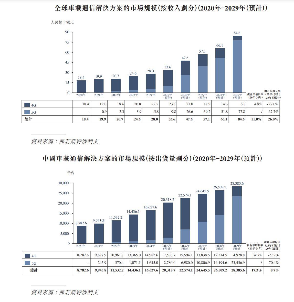 车载通信解决方案构成了实现电车安全、自动化及强化使用者体验的核心技术体系。随着电动化、自动驾驶与车联网需求同步上升,车载运算平台、通讯模块、传感器与云端服务的整合深度持续深化,带动相关产品需求稳步增长。全球与中国市场的出货量已连续数年稳健上升,预计将使行业需求维持持续上扬态势。全球与中国出货量因此连续数年扩增 – 从 2020年的38,730.3千台及8,782.6千台增长至2024年的70,328.7千台及16,627.6千台,预计2025 至2029年间将分别以6.0%及8.7%的复合年增长率持续增加,至2029年将达103,354.2千台及 28,385.6千台。该发展轨迹凸显了产业链上下游对高效能运算、低延迟互联及安全可靠软件平台的依赖,同时也反映出政策推动与消费者对智能汽车需求所带来的同步效益。