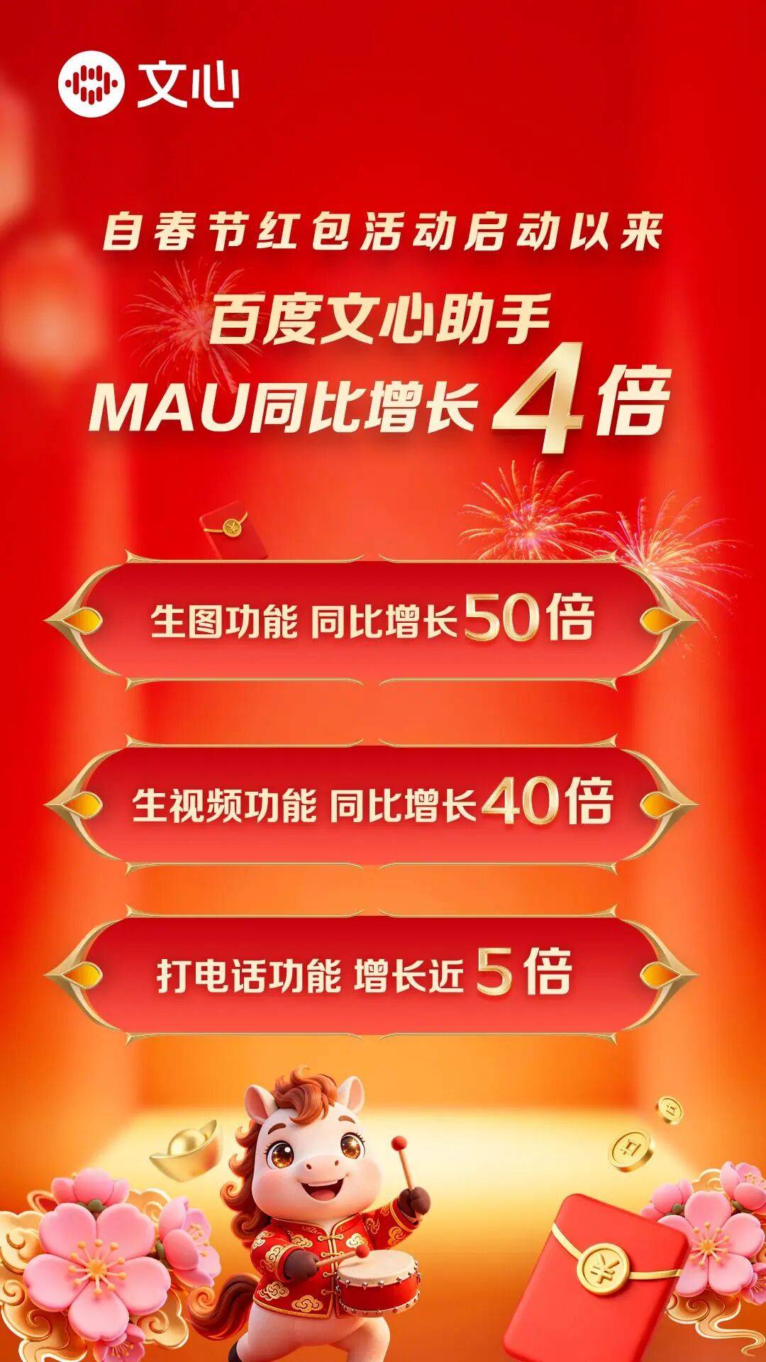 百度App文心助手在1月27日活动首日即迎来超百万用户参与,并稳居国内三大亿级AI入口之首。另有数据显示,自春节红包活动开启,百度文心助手月活跃用户同比猛增4倍,功能使用量更是呈爆发式增长:AI生图同比增长50倍,AI生视频增长40倍,AI打电线倍。