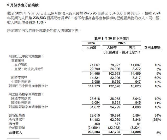 2025 年 9 月 30 日止的季度及半年度财报显示,阿里的业务中,中国电商集团靠即时零售实现 16% 收入增长,但高投入导致经调整 EBITA 同比大幅下滑 76%;国际数字商业集团盈利转正,“所有其他” 分部因处置资产收入同比下降 25%。