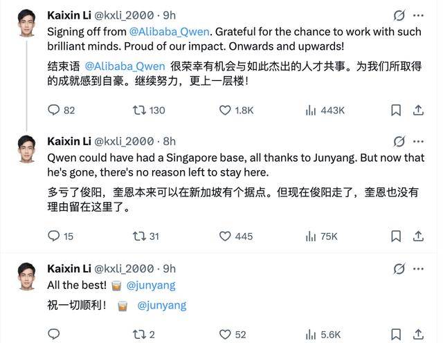 但这时候他的出现,更像是紧急灭火,因为林俊旸出走还带走了一批人,就包括Qwen后训练负责人郁博文、核心贡献者李凯新等等。
