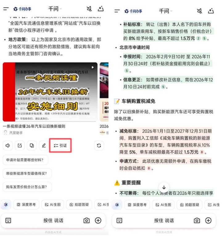 实际体验中,「引证」按钮仅在用户提问涉及新闻时事、政策动态等需参考网络信息的内容时,才会出现在回答末尾。