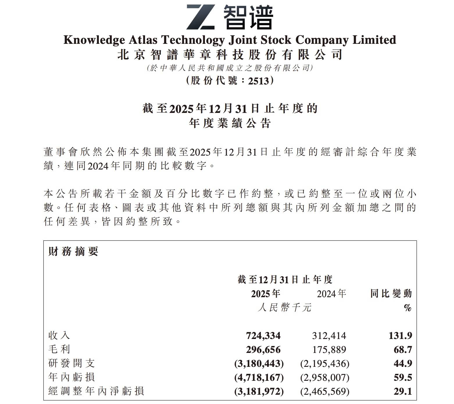 2025 年全年,公司实现总营业收入 7.24 亿元人民币,同比增长 131.9%;年内亏损 47.18 亿元,同比扩大 59.5%;经调整净亏损 31.82 亿元,同比扩大 29.1%;每股亏损 12.03 元。