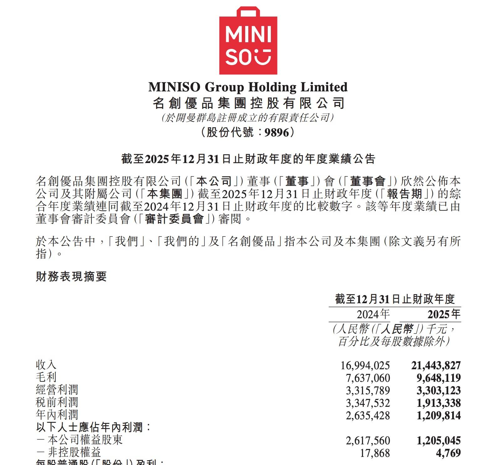 受永辉超市亏损拖累,集团按国际财务报告准则计算的年内净利润大幅下滑至人民币 12.10 亿元,较上年同期的人民币 26.35 亿元减少约 54%,主要源于名创优品于今年第一季度完成对永辉约 29.4% 股权的收购。