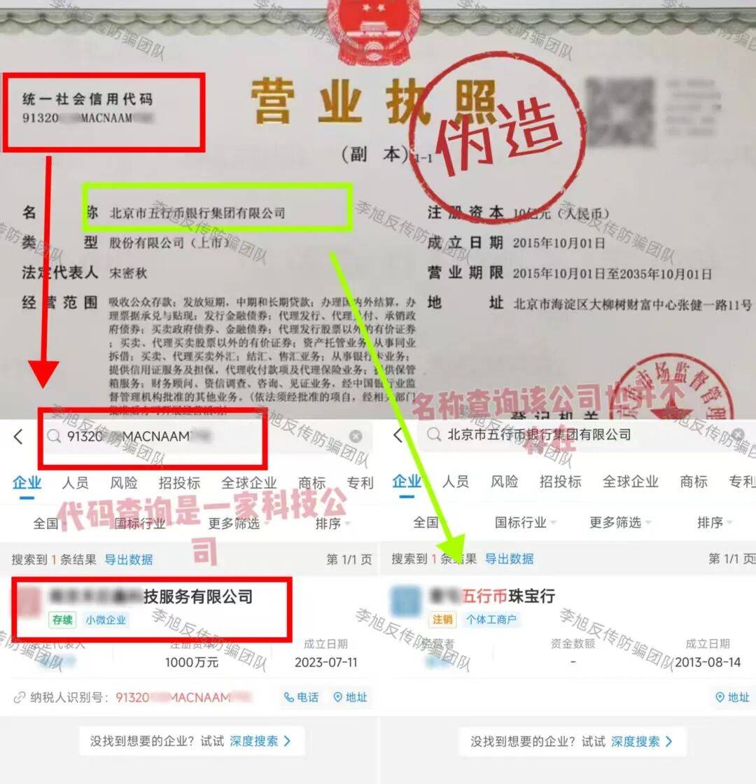 根据项目群中发布的所谓的“营业执照”信息进行核实后可以发现,该公司根本不存在。通过统一社会信用代码查找后,显示该信用代码是一家来自南京的科技公司。可见这份“营业执照”是伪造的。