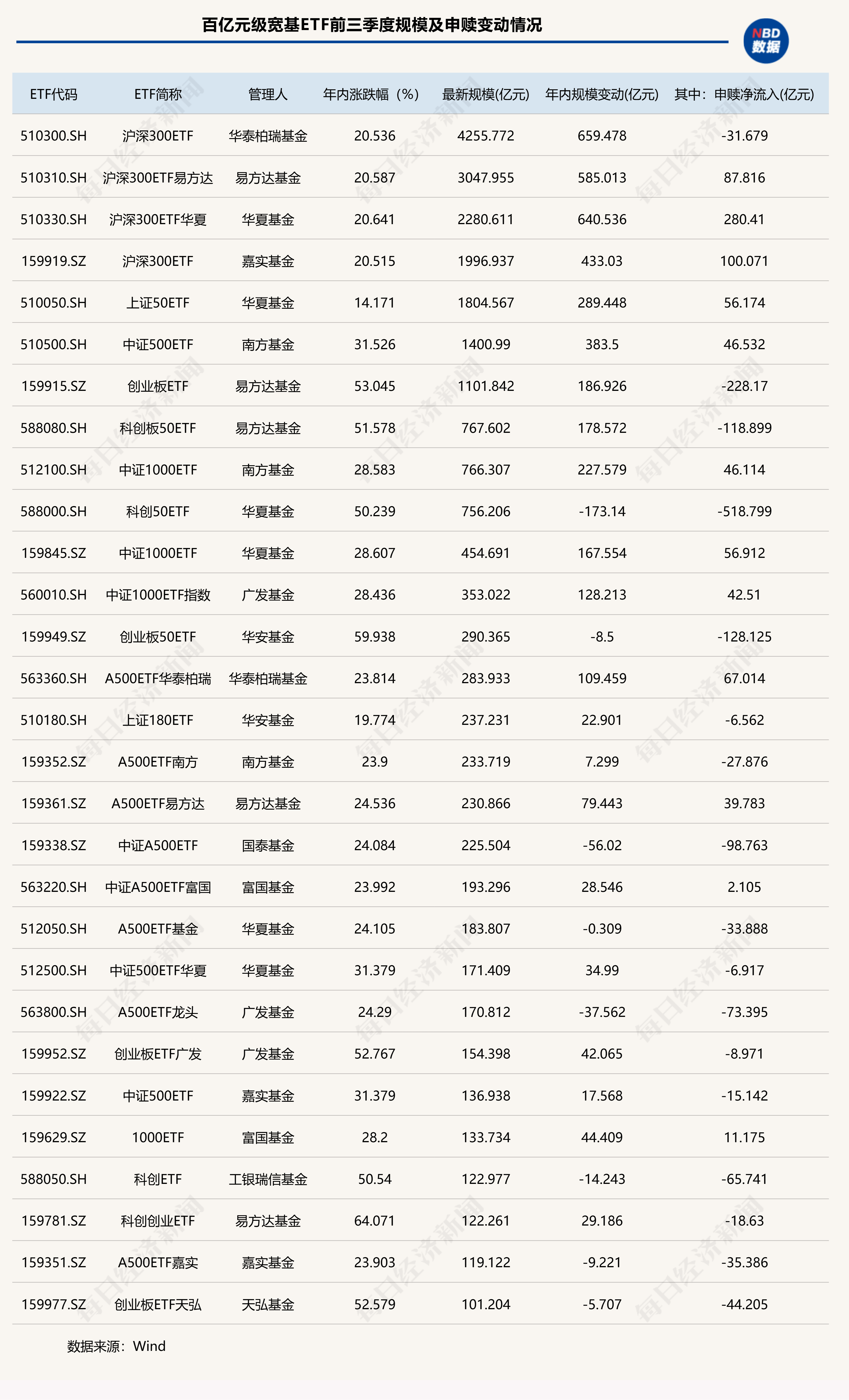 不过,从其中的申赎净流入贡献来看,规模前十名中有4只宽基ETF出现净赎回,尤其是3只年内涨幅超50%的产品:华夏基金旗下科创50ETF、易方达基金旗下创业板ETF和科创板50ETF,年内分别遭净赎回518.8亿元、228.17亿元和118.9亿元。可以看出,面对这些宽基ETF的50%以上的年内收益,不少资金选择止盈兑现。