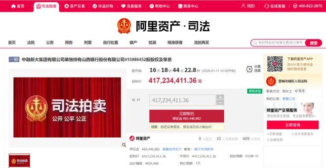 据阿里资产司法拍卖平台提供的信息显示,山西银行4.16亿股股权及孳息将于2026年1月11日公开拍卖,起拍价为4.17亿元,每股均价约1.00元。该股权的所有人为中融新大集团有限公司(简称“中融新大集团”),权利来源为司法裁定,由晋城市城区人民法院依法处置。