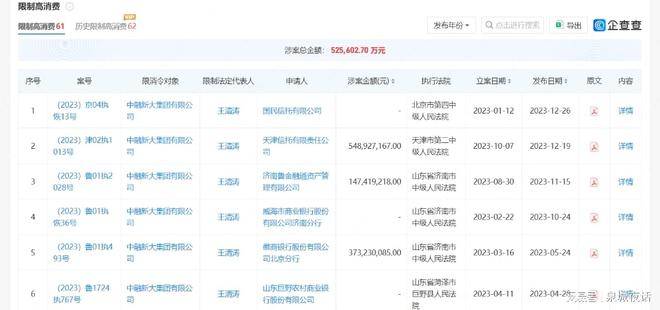 上述山西银行第四大股东中融新大集团更是多次沦为“失信被执行人”,该公司及法定代表人王清涛被各地法院61次限制高消费,涉案总金额高达52.56亿元。