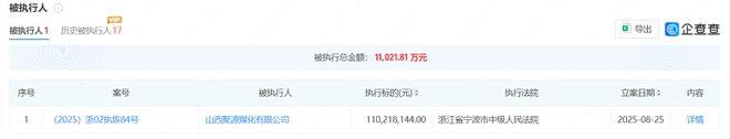此外,山西银行第五大股东山西聚源煤化有限公司也被法院列入被执行人。该公司2025年8月份被宁波市中级人民法院立案执行,被执行总金额约1.10亿元。
