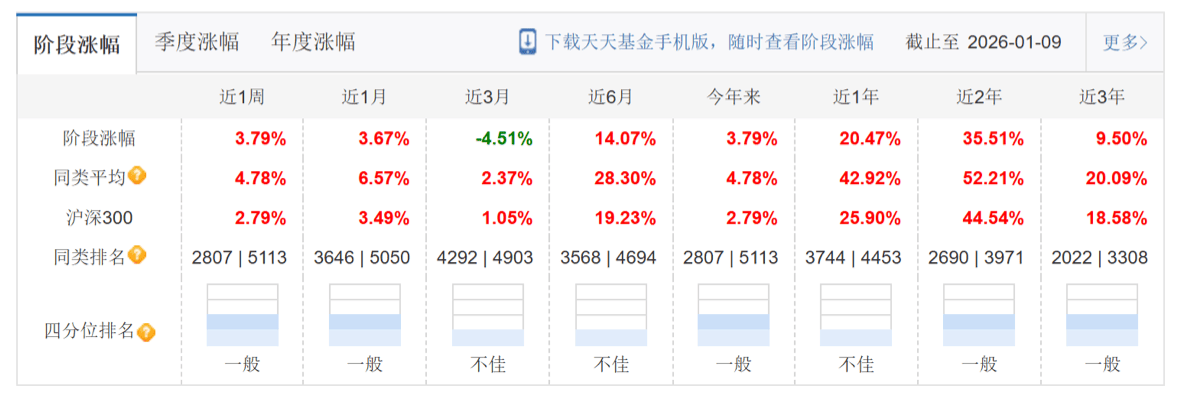 东方红权益代表作东方红启恒三年持有B的业绩惨不忍睹。数据来源:天天基金,截至2026年1月9日。