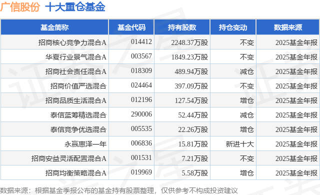 根据2025基金年报公募基金重仓股数据,重仓该股的公募基金共10家,其中持有数量最多的公募基金为招商基金的招商核心竞争力混合A。招商核心竞争力混合A目前规模为21.47亿元,最新净值1.2389(3月18日),较上一交易日下跌1.04%,近一年上涨4.7%。该公募基金现任基金经理为朱红裕。朱红裕在任的基金产品包括:招商社会责任混合A,管理时间为2023年4月26日至今,期间收益率为10.68%;招商价值严选混合,管理时间为2025年6月27日至今,期间收益率为9.51%。
